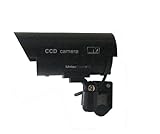 Now you can deter robbery, theft, and vandalism without the high cost of a real security camera. When placed in your home or business, even the most sophisticated criminals will think the premise is guarded by a high-tech surveillance system and go in search of an easier target. In fact, this is an actual surveillance camera that has been modified into a "dummy" or fake security camera. This unit does contain a flashing light. The camera features authentic video cable and a fully adjustable mounting bracket that will let you install the camera quickly and easily using the included stainless steel screws. Dimensions of the camera are 5 one half inches x 3 inches x 2 and one half inches (without rain shield). With the rain shield the dimensions increase to 7 x 3 x 3 inches. The camera requires 2 AA batteries that are not included.